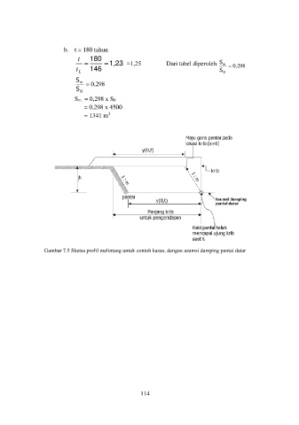 b. t = 180 tahun t 180 1,23 ≈1,25 Dari tabel diperoleh S t L 146 S m , 0 298 O S m , 0 298 S O Sm = 0,298 x S0 = 0,298 x 4500 3 = 1341 m Gambar 7.5 Sketsa profil melintang untuk contoh kasus, dengan asumsi damping pantai datar 114