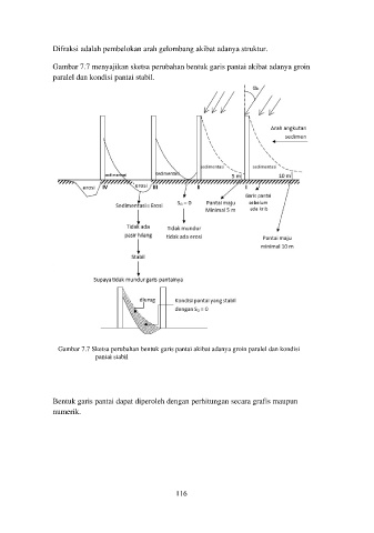 Gambar 7.7 menyajikan sketsa perubahan bentuk garis pantai akibat adanya groin