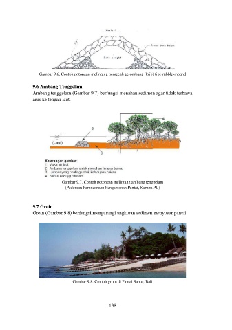 Groin (Gambar 9.8) berfungsi mengurangi angkutan sedimen menyusur pantai.
