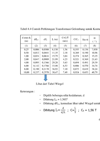 - Dihitung d/Lo, kemudian lihat tabel Wiegel untuk d/L dan Ks (= kolom H/Ho’)