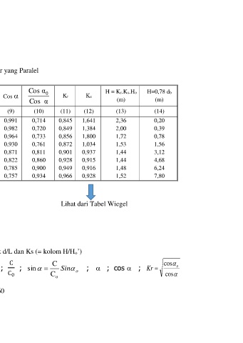 - Dihitung d/Lo, kemudian lihat tabel Wiegel untuk d/L dan Ks (= kolom H/Ho’)